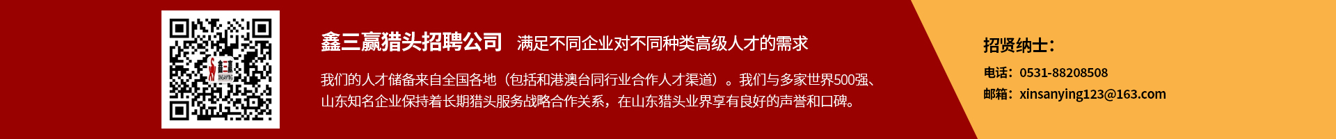 鑫三贏獵頭招聘公司(0531-88208508)是山東本土的知名專(zhuān)業(yè)獵頭招聘公司,幫助企業(yè)解決中高端招聘難題 ,免費(fèi)幫助人才推薦更好的工作機(jī)會(huì)。公司總部位于山東省省會(huì)濟(jì)南市。我們致力服務(wù)于山東省內(nèi)大中型內(nèi)外資企業(yè),我們通過(guò)對(duì)客戶(hù)企業(yè)的組織結(jié)構(gòu)、相關(guān)業(yè)務(wù)和具體職位的研究、分析,能夠很好的與企業(yè)及候選人進(jìn)行溝通,滿(mǎn)足不同企業(yè)對(duì)不同種類(lèi)高級(jí)人才的需求,我們的人才儲(chǔ)備來(lái)自全國(guó)各地(包括和港澳臺(tái)同行業(yè)合作人才渠道)。我們與多家世界500強(qiáng)、山東知名企業(yè)保持著長(zhǎng)期獵頭服務(wù)戰(zhàn)略合作關(guān)系,在山東獵頭業(yè)界享有良好的聲譽(yù)和口碑。